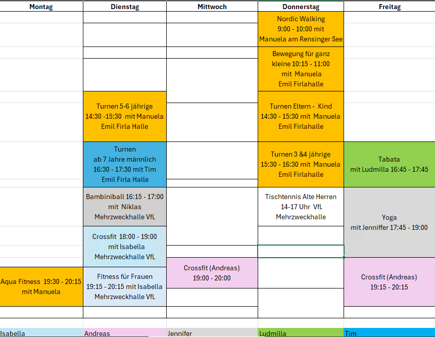 Momentan finden andere Kurse aus Personalmangel nicht statt. Siehe auch die Aushänge beim VfL. Es soll zeitnah, Zumba, BBP, Seniorenfitness und diverse Rehakurse ( auch Lunge, Herz und onkologische Nachsorge) im VfL geben. Wir bitten um Verständnis. Der Vorstand. 0176/83284606 Marco anrufen bei Bedarf.