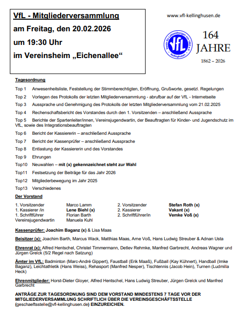 Am Dienstag den 03.02.2026 hat unsere VfL – Geschäftsstelle von 17:00 Uhr – 19:00 Uhr ( ehrenamtlich) zur Mitgliedersprechstunde geöffnet.